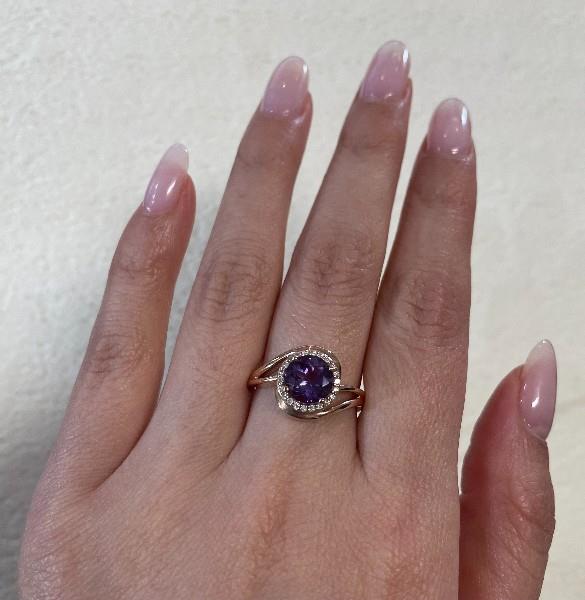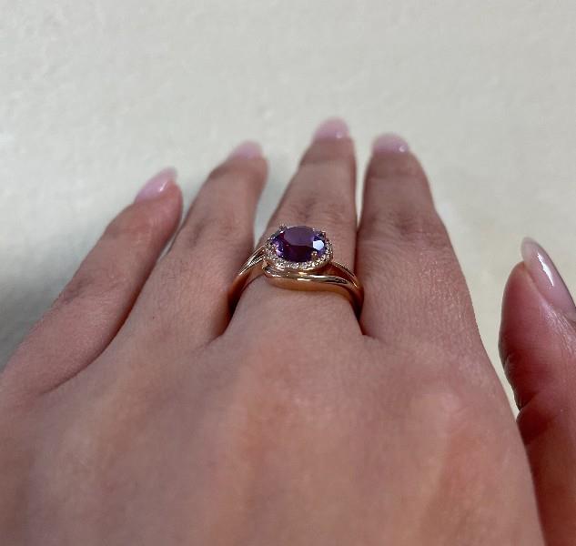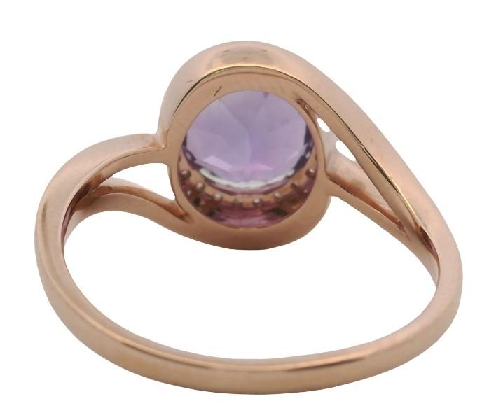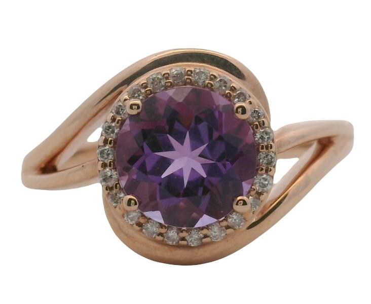 A 14K R.G ROUND AMETHYST OF 1.77CT & DIAMOND(.11CT) HALO WAVE BAND RING, SIZE: N1/2, T.W.: 4.2GRAMS