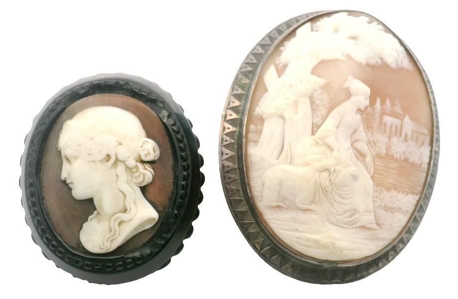 Both antique, the larger set in 950 silver, English, of high domed form, the shell cameo depicting a maiden within a rural village scene, framed in finely worked silver of geometric design, fitted with pin, the second of deep profile, set with central profile cameo, edged in a stepped black vulcanite frame, completed with pin.