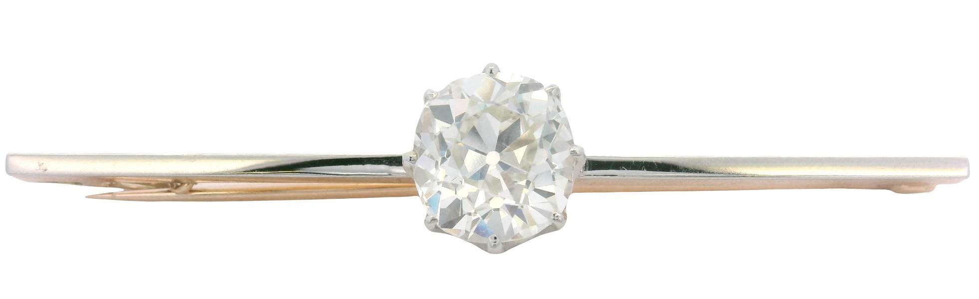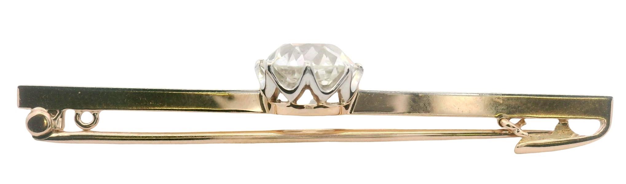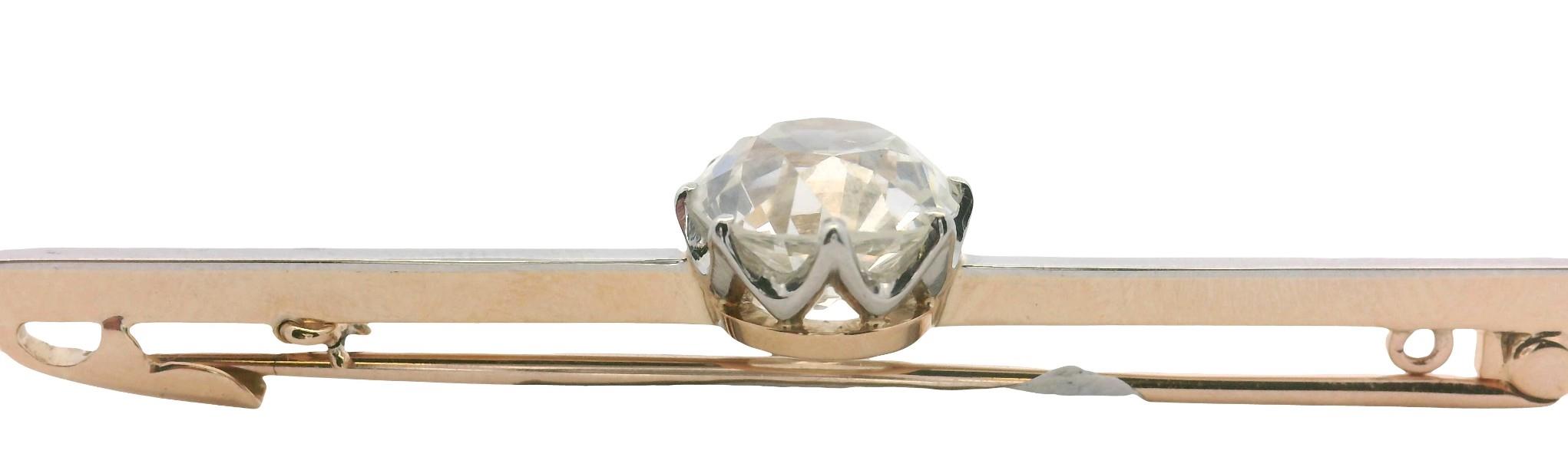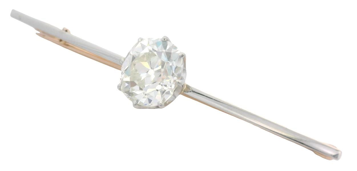 Gold and platinum setting, presented as a fine and simple straight railed bar brooch, centrally detailed by an old cut diamond of oval/off round shape, weighing approximately 2.50ct, claw set in a scalloped claw setting, completed with brooch pin and safety latch.