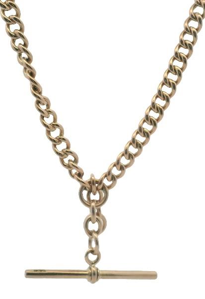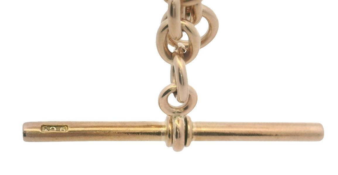 9ct rose gold, of classic antique style, solid and uniform thickness throughout, plain polished curb links, fitted with two bulldog clips as clasp and suspending a T-bar from short chain length, along with a second chain length for additional fob pieces. Length: 40cms