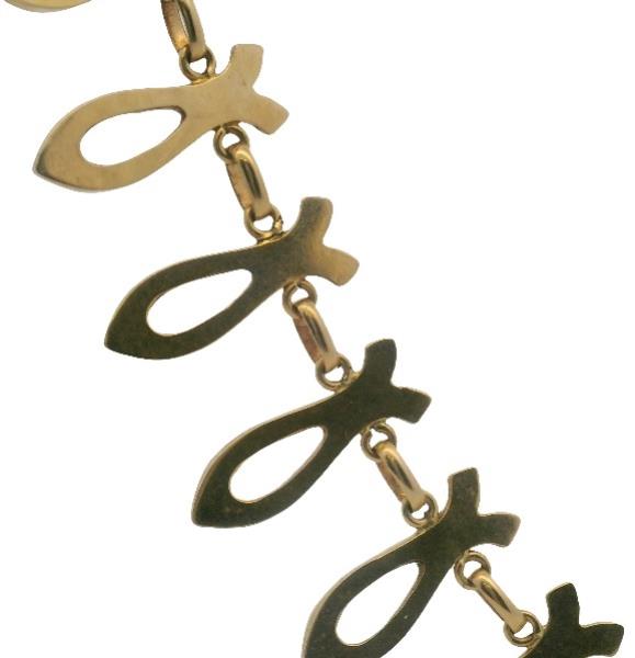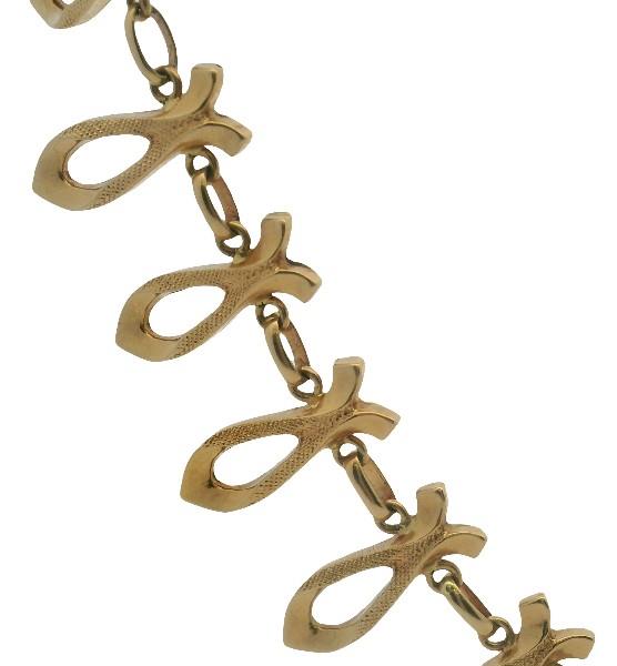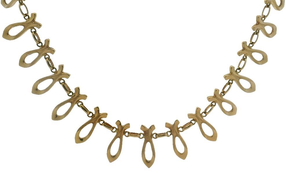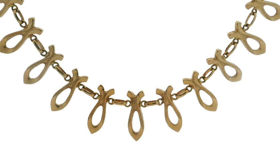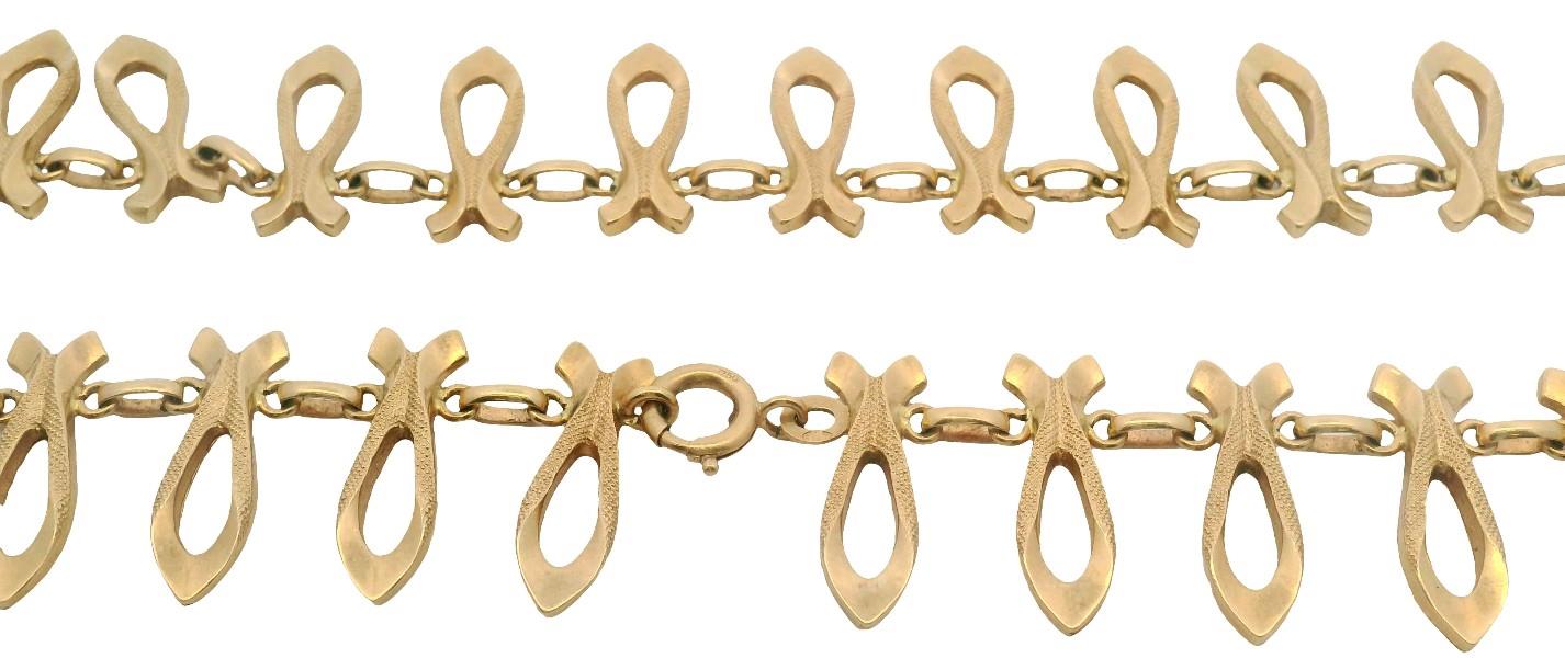 18ct yellow gold, hallmarked by Italian manufacturer UnoAerre of vintage Retro form, comprising open spear shaped radiating links of polished and textured finish with tapered inner detail, connecting to single oval shaped polished connecting links horizontally arranged, completed with round clasp. Length: 41.5cms