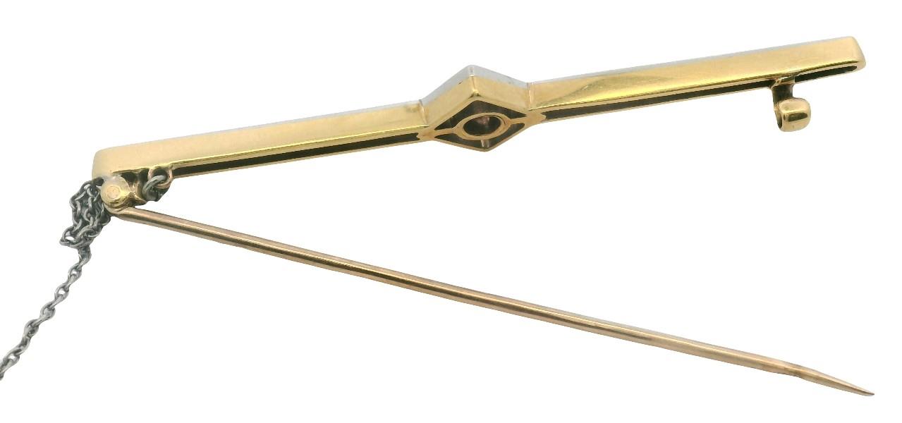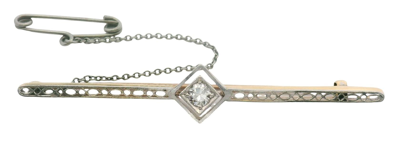 14ct yellow gold back with platinum top setting, presented as a pierced fret worked rail, centrally embellished by a kite shaped panel set with single old cut diamond of approximately 0.10ct, framed by a spaced polished surround, fitted with pin and safety chain. Length: 5.5cms