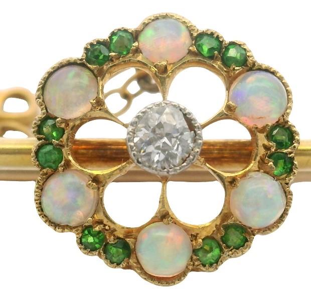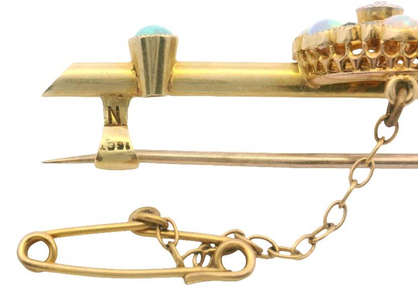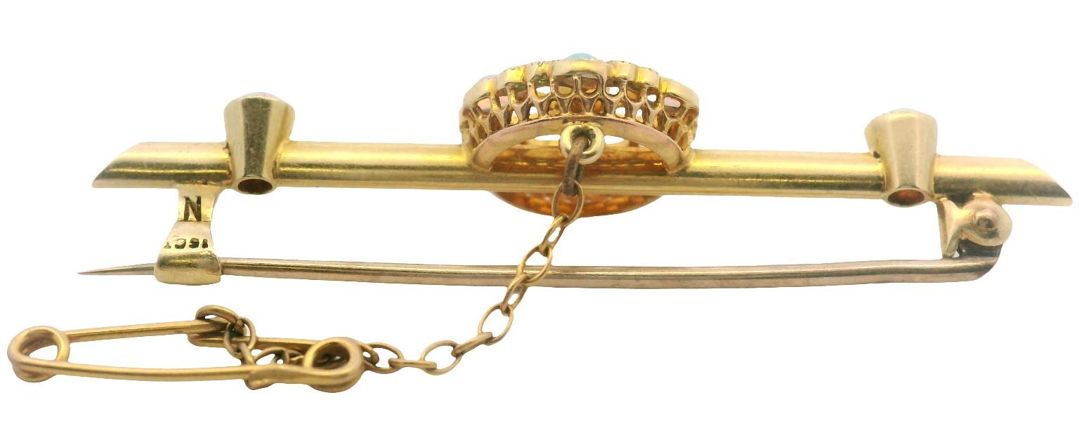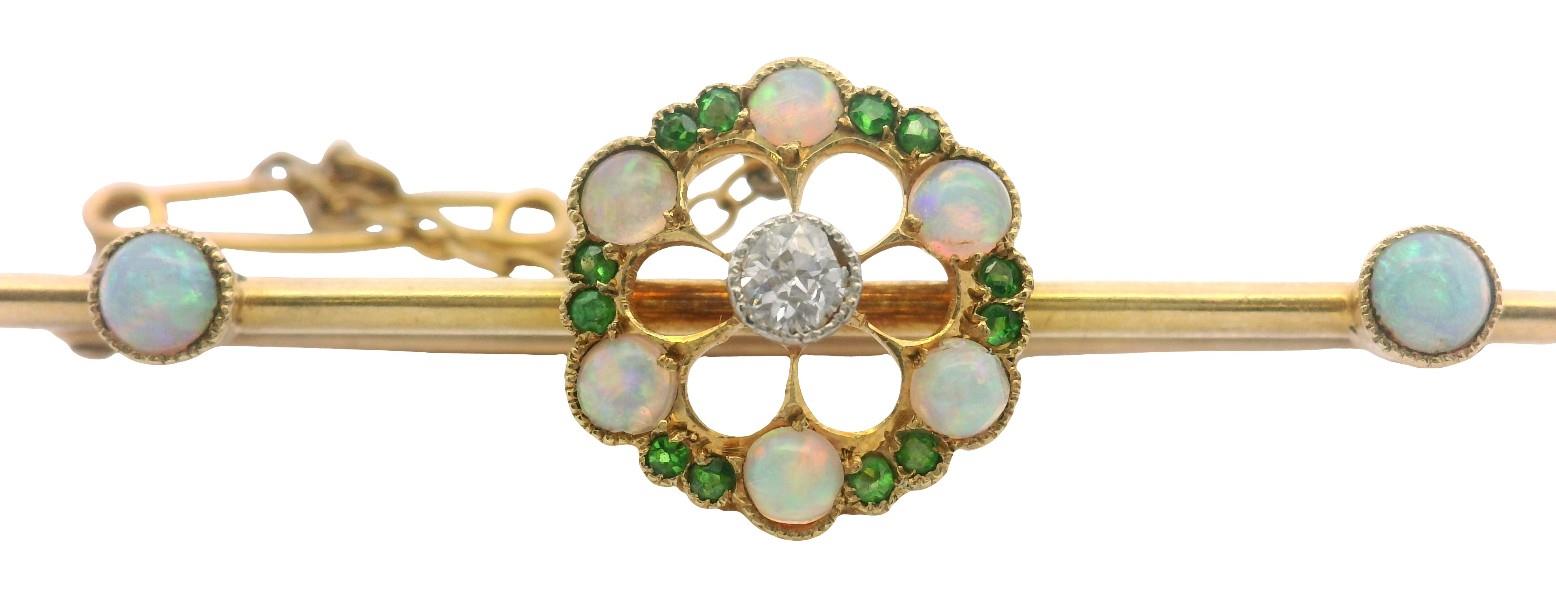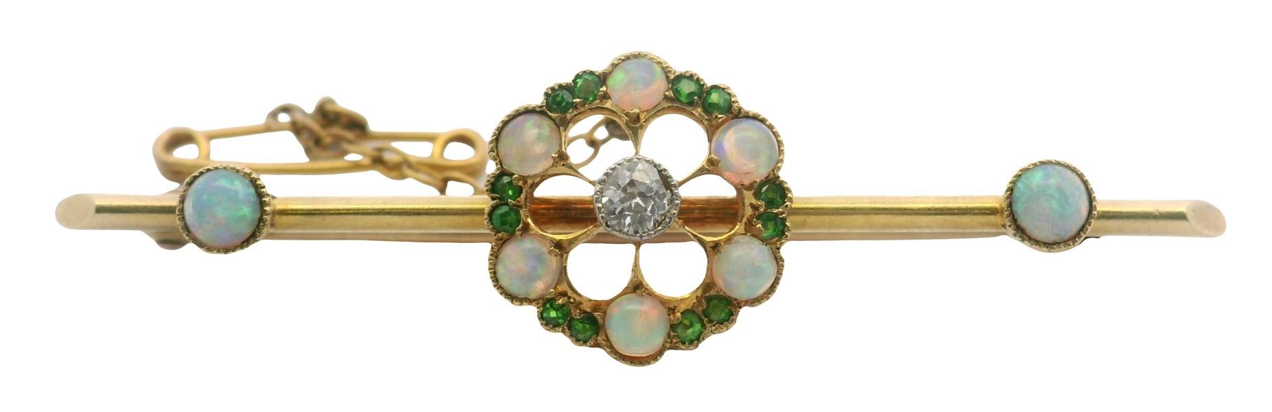Stamped 15ct, yellow gold, featuring a fine single rail of gold, centrally supporting an open worked floral cluster, set with central old cut diamond of approximately 0.05ct, framed by radiating fine gold 9ct rails to the frame of smaller cabochon cut crystal opal and garnet, millgrain scallop set, two further opals feature to bar ends, fitted with pin and safety chain. Length: 5cms