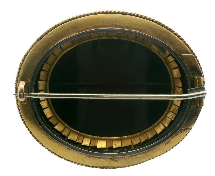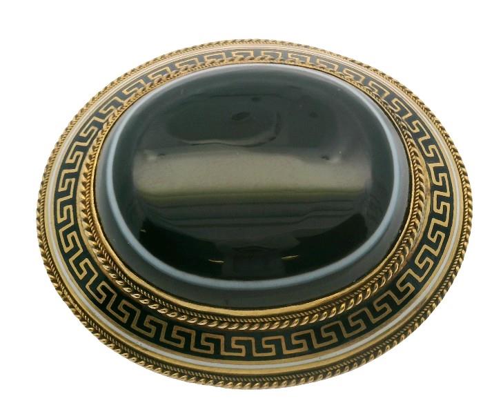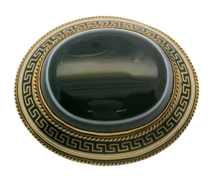 15ct yellow gold top with inner steel sleeve fitted to inner frame, centrally detailed by a large oval cabochon panel of black and white striated sard onyx, rope twist edged, stepping down to a black Grecian Key pattern enamelled frame and a white rim, further rope work to outer edge, completed with brooch pin, open to reverse.