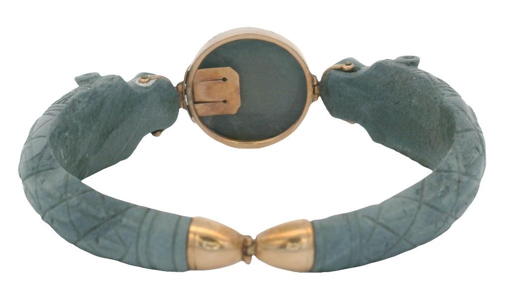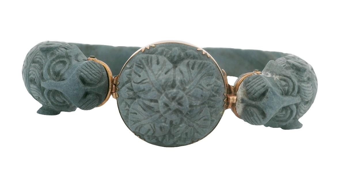 Very early Grey Lava Carved bracelet adorned with Lions heads grasping a high domed flower design disc with rose gold fittings, rare with few surviving due to the delicate nature of the carving. These bracelets were popular souvenirs from Italy in mid to early 19th century. Makers mark is worn on one corner of the tongue and on the other corner is an Italian control mark with a 9ct This is a fine example and presents in excellent condition. Total weight: 23.6 gram