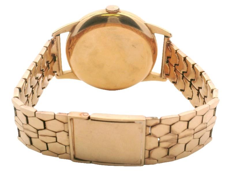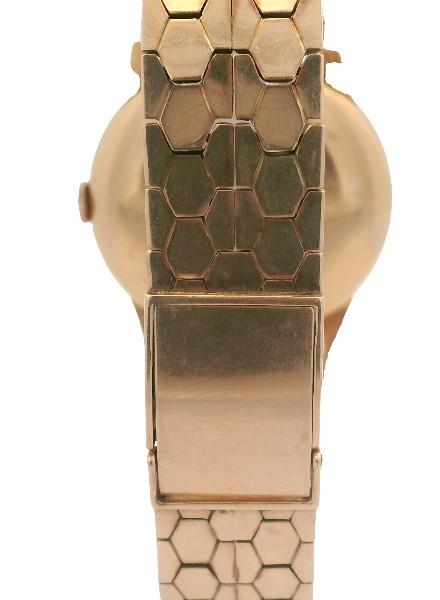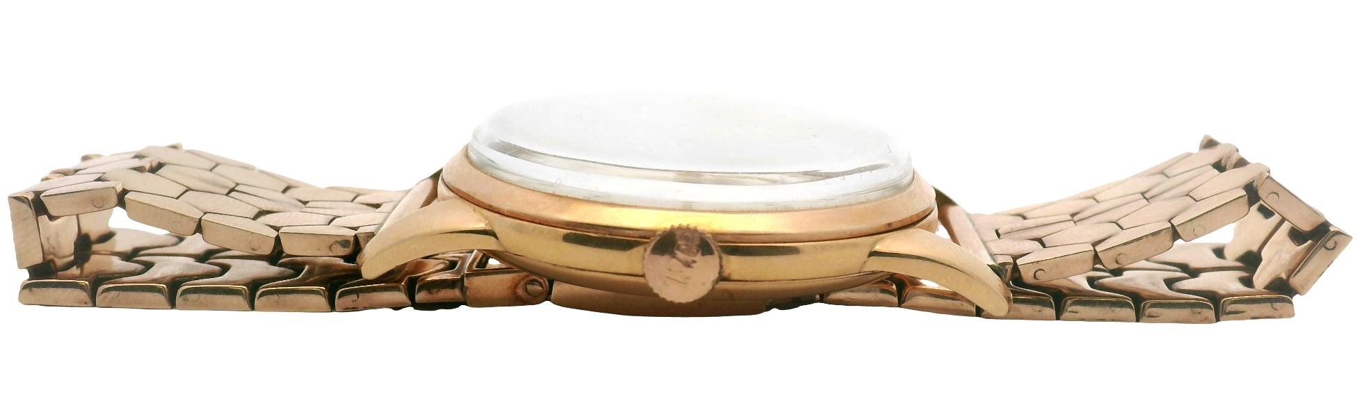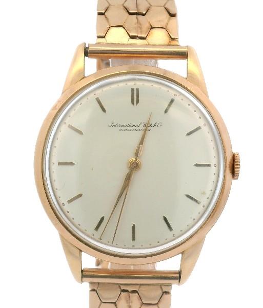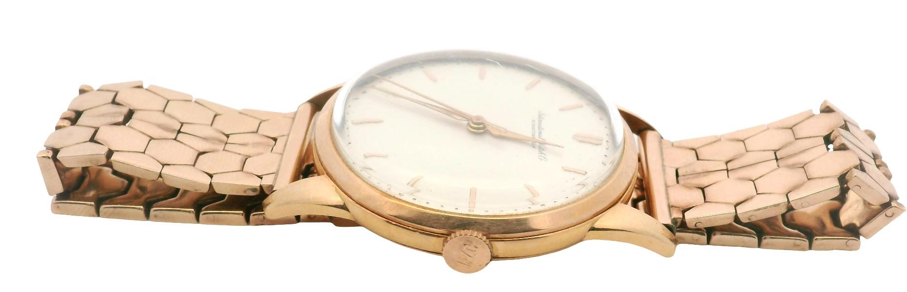 18ct rose gold International Watch Company Schaffhausen Gents wristwatch with cream dial and baton numerals Circa 1950's to 1960's. This is a fine example of a classic IWC manual winding wristwatch in a 35mm case. Presented on a honeycomb style solid 14ct rose gold bracelet, this is a classy watch for the refined gentleman. The timepiece shows some signs of wear due to its six decades of heritage, however, is in working order.