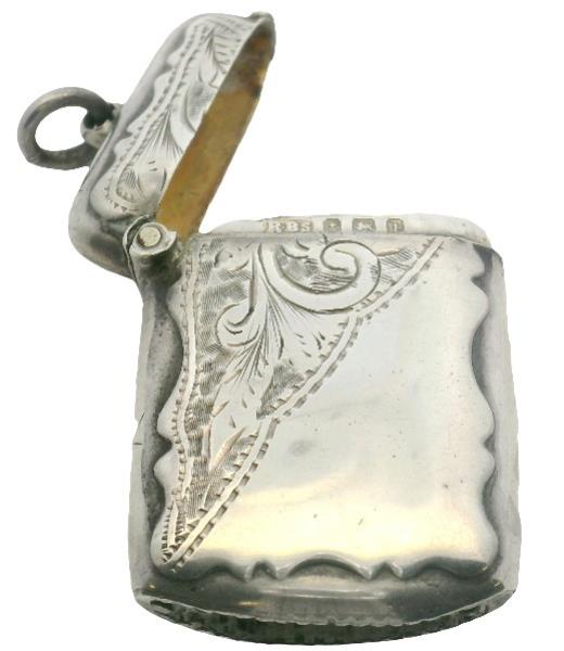 Sterling Silver, fully hallmarked Birmingham 1908, by manufacturer Rolason Brothers, foliate engraved outer case, gilt washed interior, completed with bail. Length: 3.8cm
