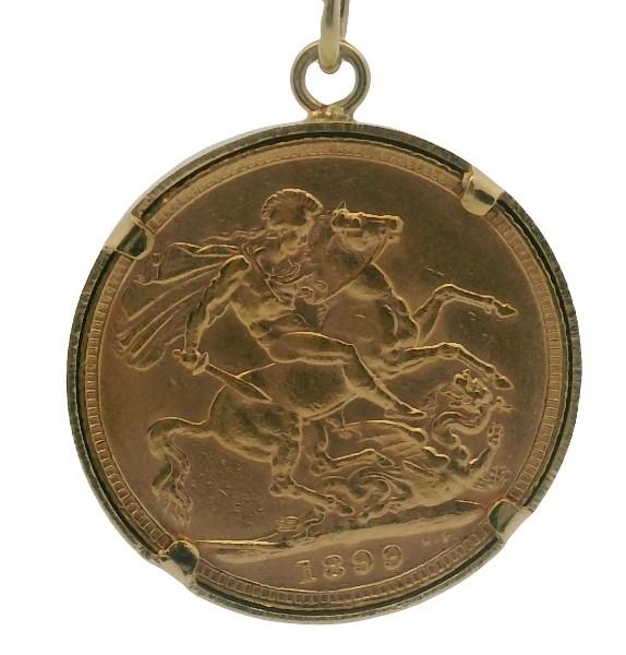 A 1899 FULL 22K YELLOW GOLD SOVEREIGN, WEIGHING 7.98GRAMS & 9.4GRAMS WITH FITTED BAIL