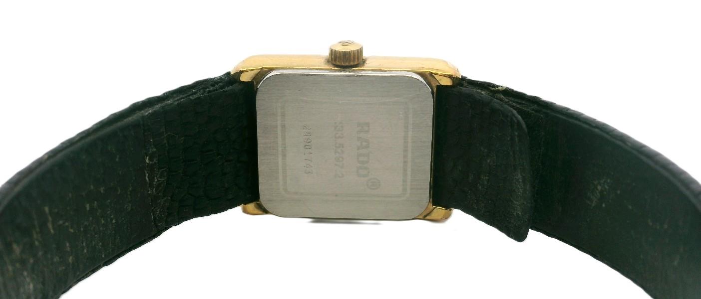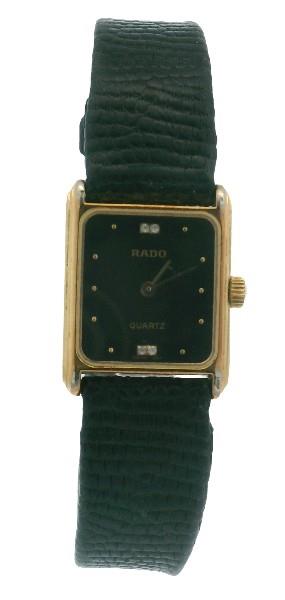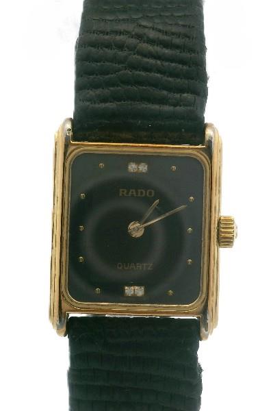 Yellow gold plated steel case, rectangular, fitted with quartz movement, with black dial, dot and diamond set markers, two hands, fitted to black leather strap.