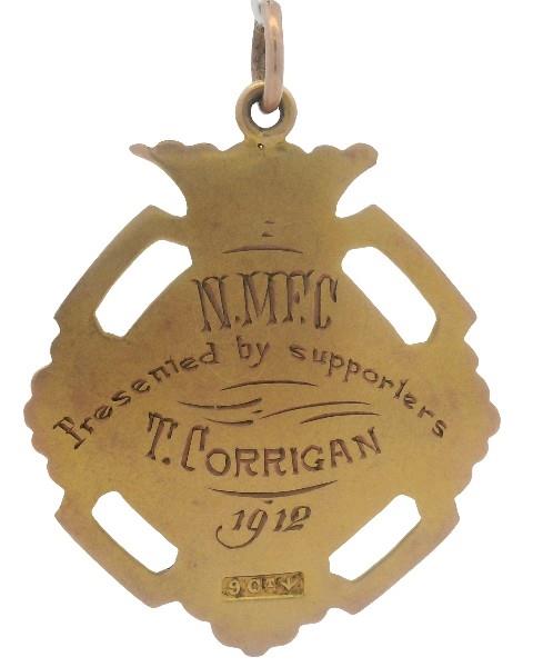 9ct rose gold with high carat yellow gold wash, of traditional shield shape with central rose gold panel engraved with cartouche, to reverse further inscription, dated 1912, completed with bail.