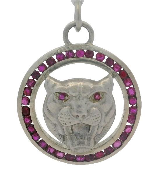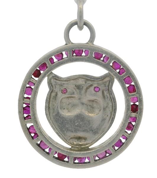 Sterling Silver, presented as an outer frame of channel set round rubies of strong red/pink colour, edged in silver, centrally detailed by a stylised tiger/big cats head, also ruby set to eyes, completed with bail. Length: 3cms