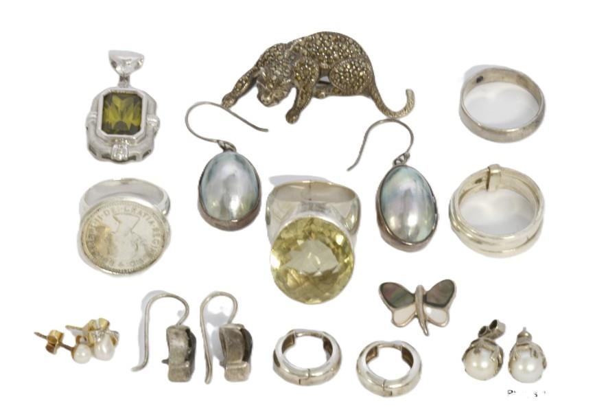 Silver jewellery pieces including 4 rings, 1 Marcasite Leopard brooch and a Mother of Pearl Butterfly brooch, a pendant and 4 pairs of earrings. Total weight of 76.4 grams