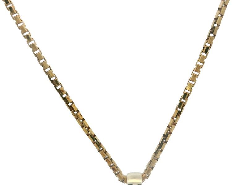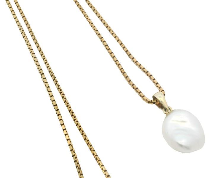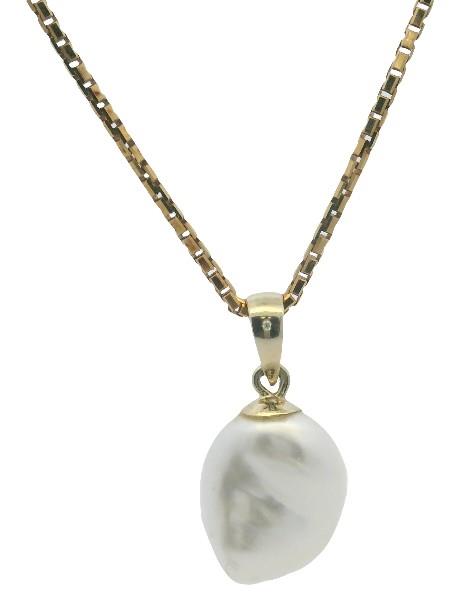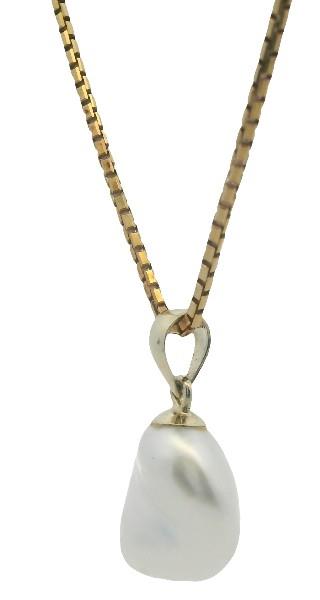 Silver white fine lustre Baroque Pearl pendant measuring 9.7 x11mm with 9ct gold bail is suspended from 9ct box link chain approximately 44cm in length. Total weight: 3.4 gram
