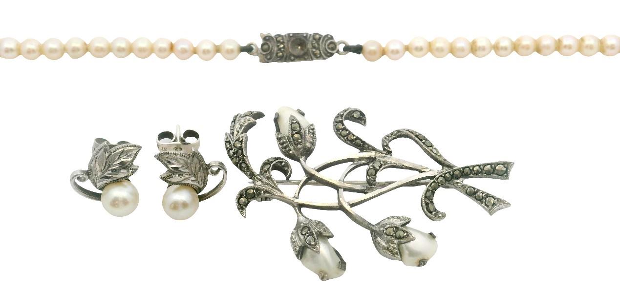 Strand of graduated pearl approximately 40cm in length with Marcasite rectangular silver clasp marked Sterling Germany. Silver Leaf design Pearl stud earrings, and Marcasite and Mabe pearl brooch with 3 pearls stamped Sterling 935. Total weight: 22.6 gram