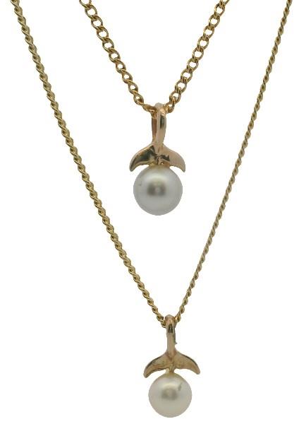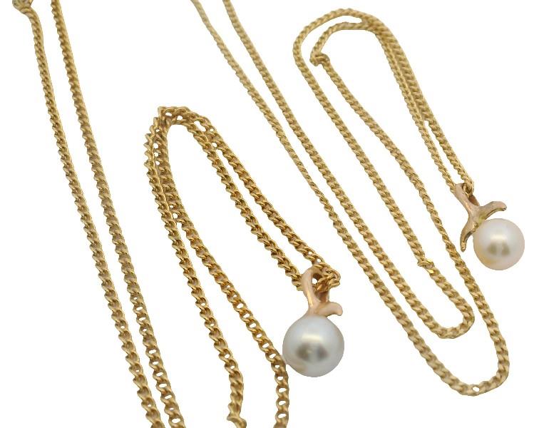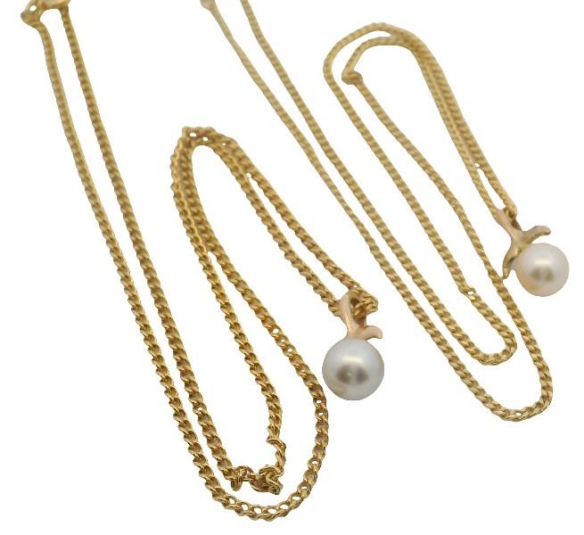 Two small pearl pendants set in 14ct yellow gold, and both presented on costume dress chains. The larger of the two pearls has a slightly silver colour and the other has a golden tinge, and both have lovely lustre. Total weight: 1.6 gram on costume chains 6.3 gram.