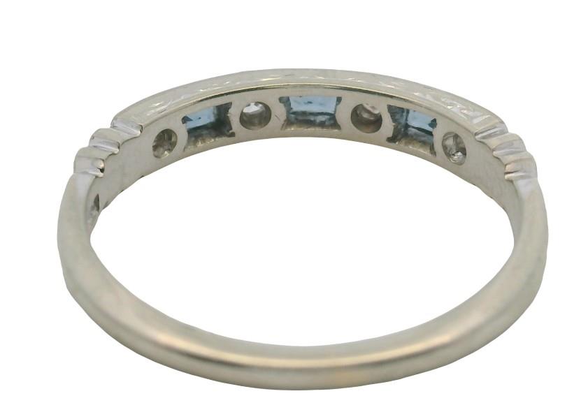 Fine 18ct white gold band ring set on a low profile with 3 emerald cut Sapphires and 4 round brilliant cut Diamonds. Total weight: 2.3 gram