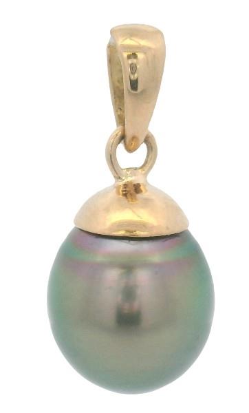 18ct yellow gold fitting, featuring an egg-shaped Tahitian Pearl, measuring 11mm, medium to light grey body colour with purple, green and yellow overtones, fine lustre, drilled and capped, fitted with a polished tapered bail. Height: 26mm.Total Weight: 3.12g