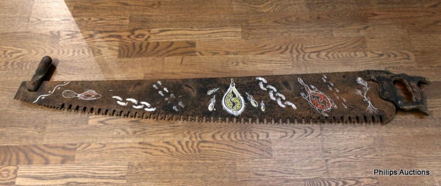 A LARGE DOUBLE HANDED PAINTED SAW BLADE