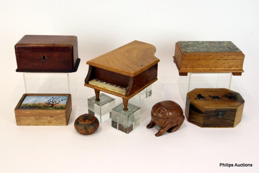 Comprising a musical windup box in the form of a grand piano, a carved wooden box in the form of a toad, a keepsake box in quarter sawn hardwood with flecks, reeded sides and an abalone mosaic tile top, a 'Jerusalem' octagonal box painted with camels in silhouette, another with a copper enamel top, a small work box with a velvet lined interior and another.