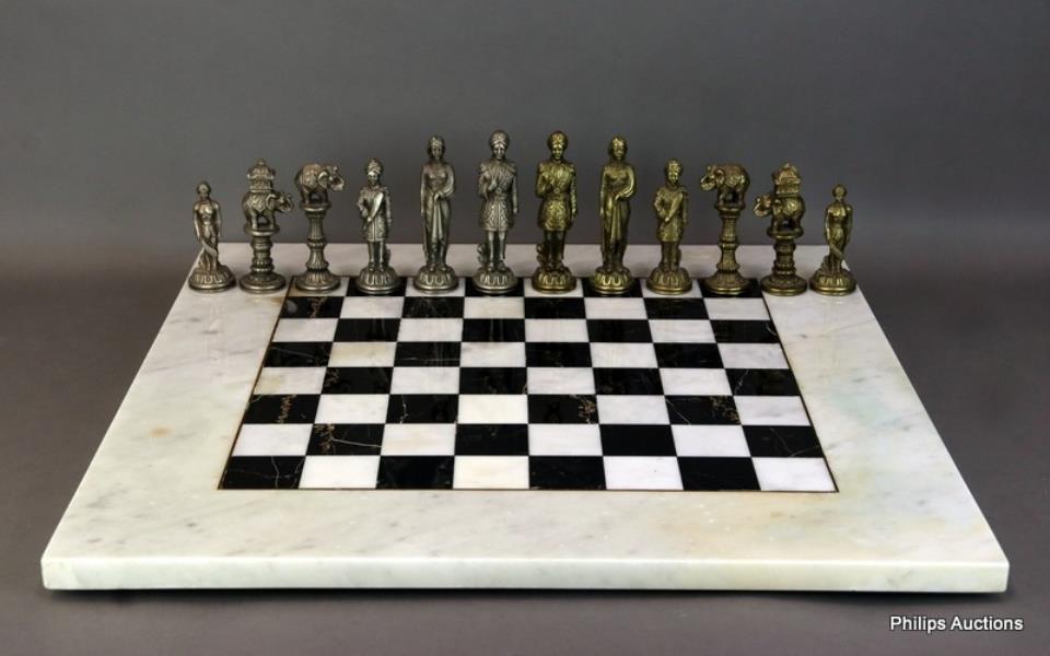 The large polished marble chessboard with a complete set of figural Indian themed cast brass and white metal pieces, each on circular bases with green and red velvet pads underside.