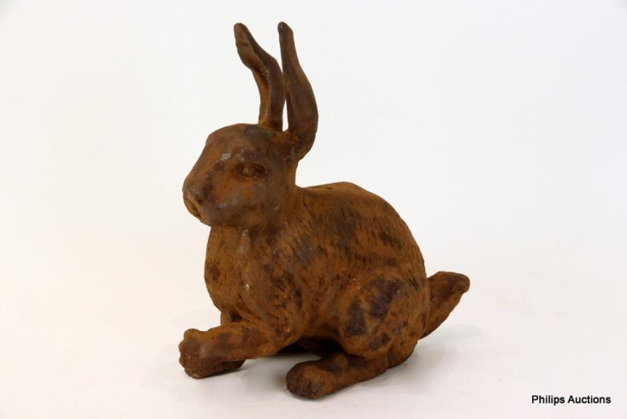 The cast iron figure of an alert rabbit with rust patina.