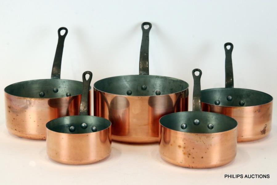 The heavy gauge copper set of straight-sided saucepans, tin lined, with rivet joined steel handles.