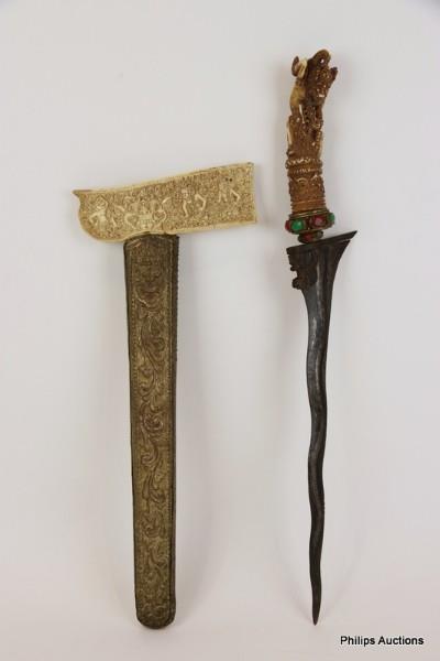 The wavy tapering iron blade pattern-welded with pamor and with winged lion perabot, in its wood-lined and scroll embossed gilt metal scabbard with large ivory sarongan carved in relief on both sides with scenes from Balinese Hinduism and with a central protective monster mask (karang bhoma) to one side, the horn hilt carved as the demon Bhuta Nawasari.