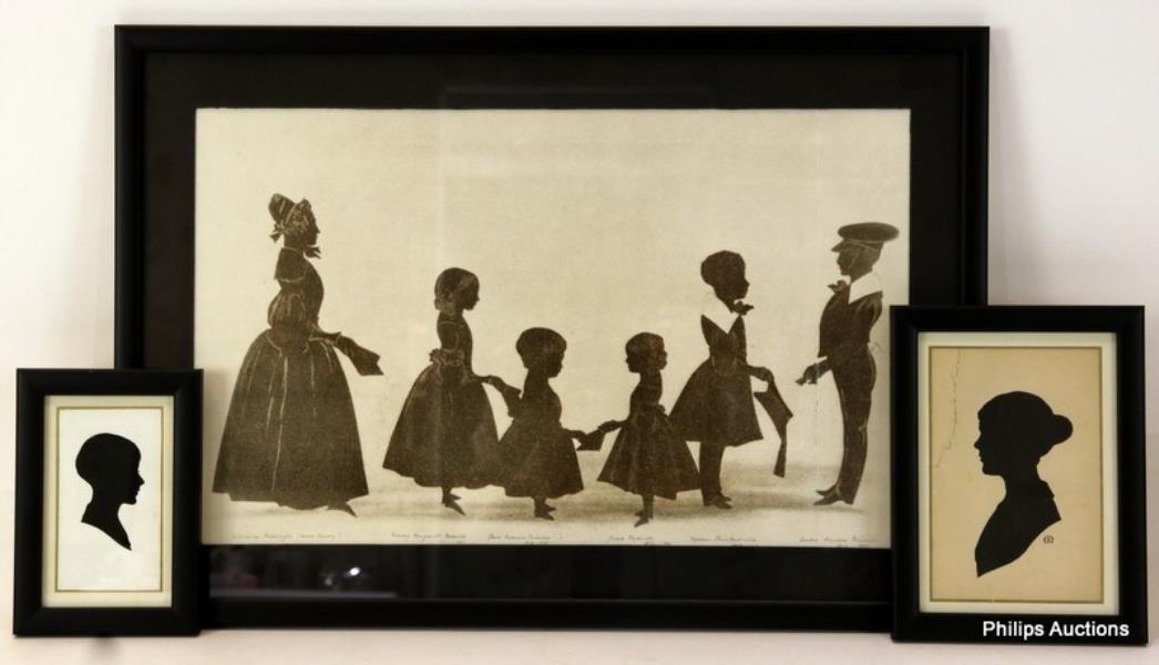 Comprising two small silhouette bust portraits, scissors cut from black inked paper mounted on white card, one embossed with Handrup mark, together with a later printed photograph of a full length silhouette family portrait.