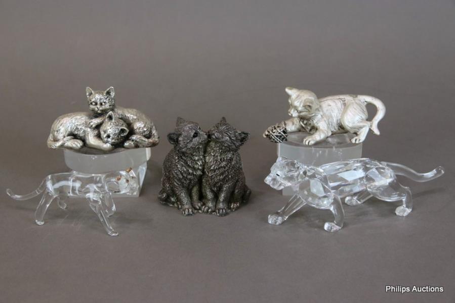 Comprising a Comyns of London silver filled 'Kittens Licking' figurine, stamped and with label underside, together with two other kitten figurines in white metal, a Swarovski crystal 'Leopard' (Des. Michael Stamey, 1997, No. 217093) in faceted clear crystal with amber tone eyes, and a glass ocelot (spotted wild cat) from Costa Rica.