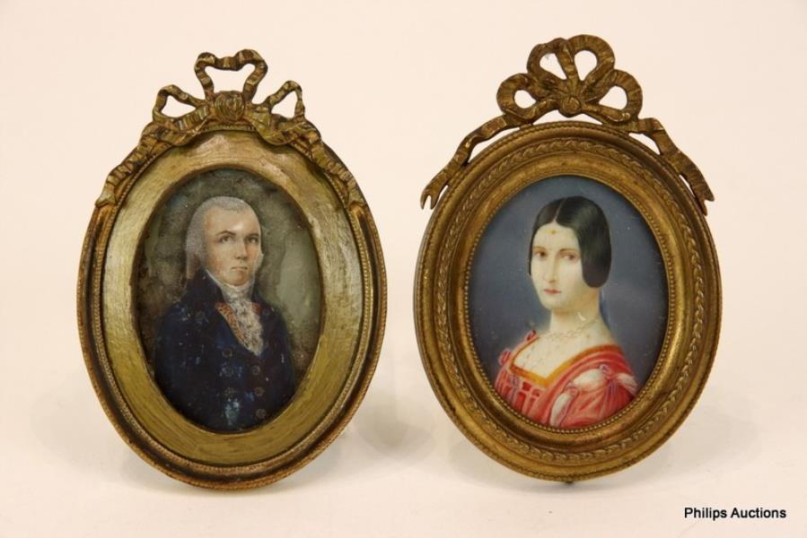 The miniature oval busts of a lady and gentleman painted on ivory laid on card, housed in gilt metal ornate frames, one with easel back, both unsigned.