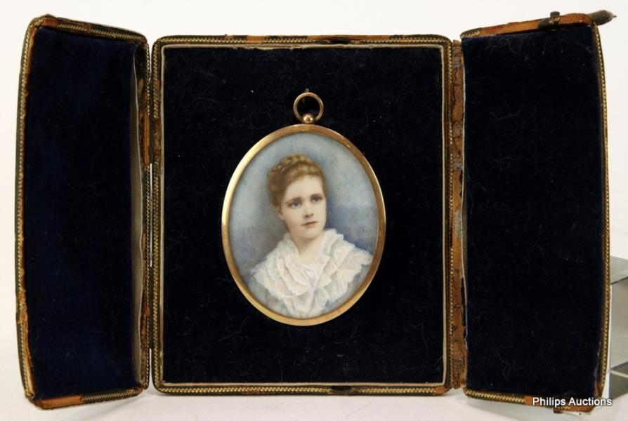 The oval bust portrait of G. Mieville (1884), watercolour on ivory laid on card, in a gilt metal ornate frame with bail attachment, within a blue velvet lined and green leather fitted case, unsigned.