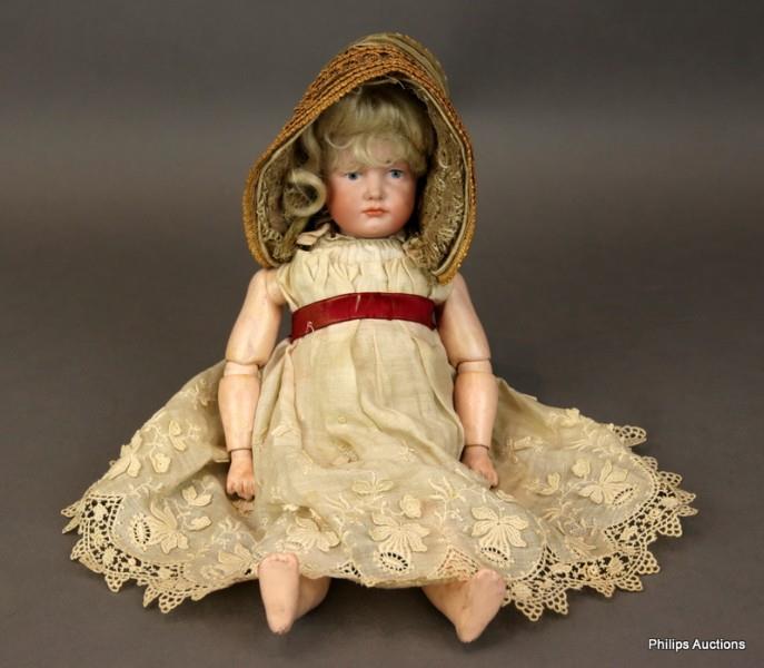 The character doll of cabinet size with painted blue eyes, closed pouty mouth and a blonde wig on a fully jointed composition body, dressed in frilled and embroidered cream voile and wearing a woven rattan bonnet, stamped the back of the head with 'K star R' mark and numbered 114 and 26.