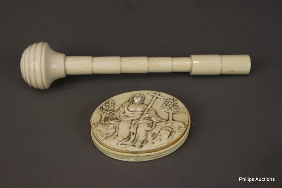 The c1900 ivory parasol handle with a stepped design, together with an oval trinket box (a/f), the cover relief carved with a religious scene, probably Dieppe ivory 19th century.
