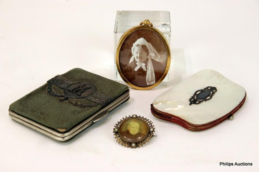 Comprising two Victorian coin purses in mother-of-pearl and green leather, each with lined interiors with compartments, a miniature gilt metal frame with a print portrait and a portrait brooch.