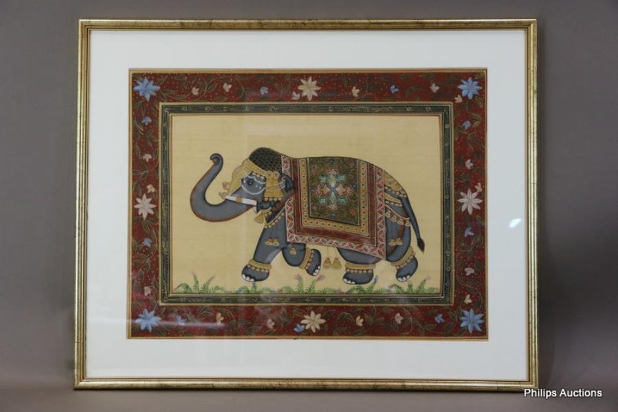 Finely painted on cloth and depicting an elephant caparisoned with an ornate blanket surrounded by wide and narrow patterned and floral borders.