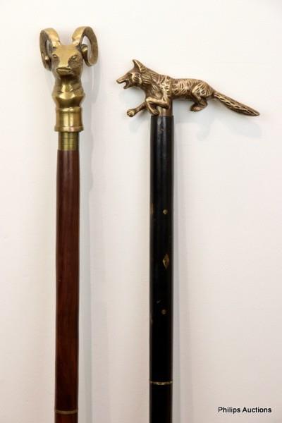 Comprising one with a cast brass fox handle to an ebonised and brass inlaid shaft unscrewing in three parts, the other with a ram's head cast brass handle to a shaft also in three parts.