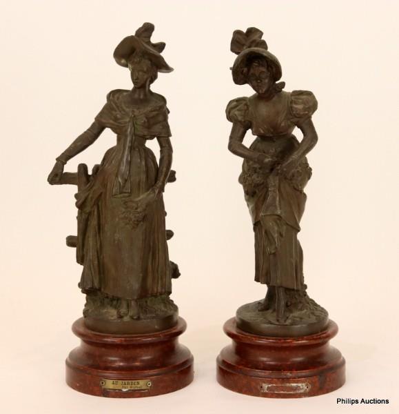 Comprising one titled 'Au Jardin Par Rigual' in bronzed spelter depicting a lady in a flowing dress holding a bouquet by a garden fence, the other missing the title plaque, raised upon a faux rouge marble waisted wooden bases.