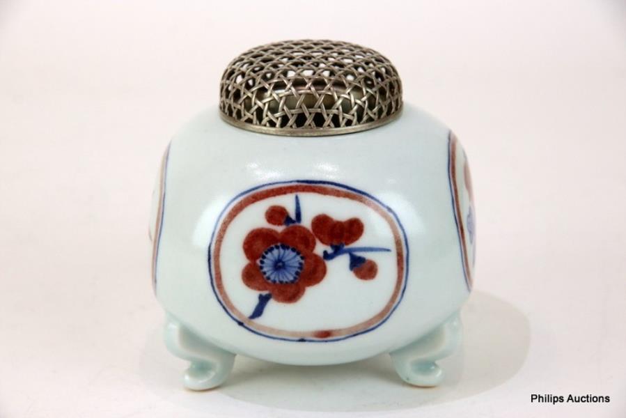 The fine Imari studio porcelain censer of squat globular form on tripod scroll feet, decorated with four oval floral panels in underglaze blue and iron red, with a fine domed mesh cover engraved with characters to the inner rim (X-Ray tested as silver plate), and with impressed studio mark to the underside.