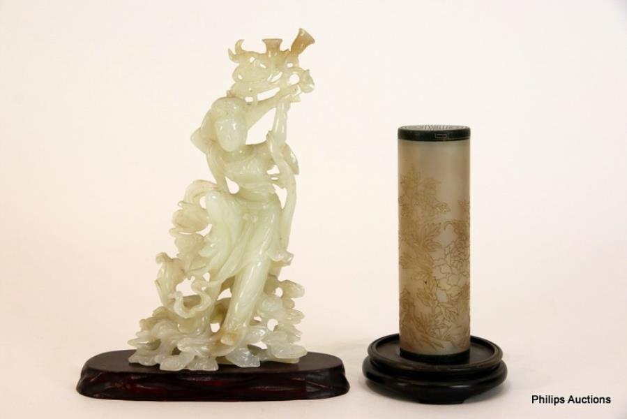 Comprising a carved jade figure of a lady musician dancing playing the pipa behind her head, upon a reticulated scroll base and carved stand, the stone of greyish white tone, together with a celadon jade box or parfumier, the cylindrical sides incised with butterflies and floral sprays, and pierced towards the base, the dark green jade removable flat cover incised with longevity character.