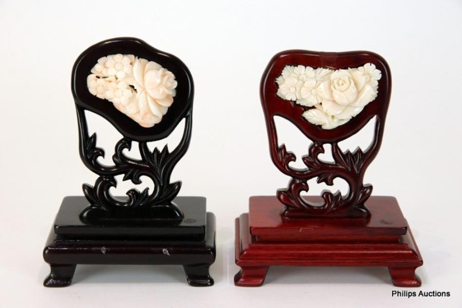 Carved in very pale pink to white coral, the floral ornaments with blossoming rose and foliage, inset in custom reticulated stands with scrolls mounted on platform bases with short feet.