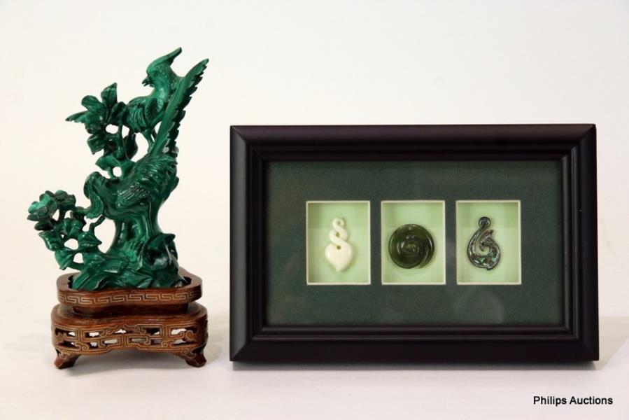 Comprising a carved malachite pheasant group depicting two pheasants on rocks with foliage upon a custom carved wooden stand with brass inlay fretwork, together with a set of three Maori symbols carved in bone (Koru), greenstone (Twist) and abalone (Hook) and housed in a shadow box frame (Dis. Dale Borland, Auckland).
