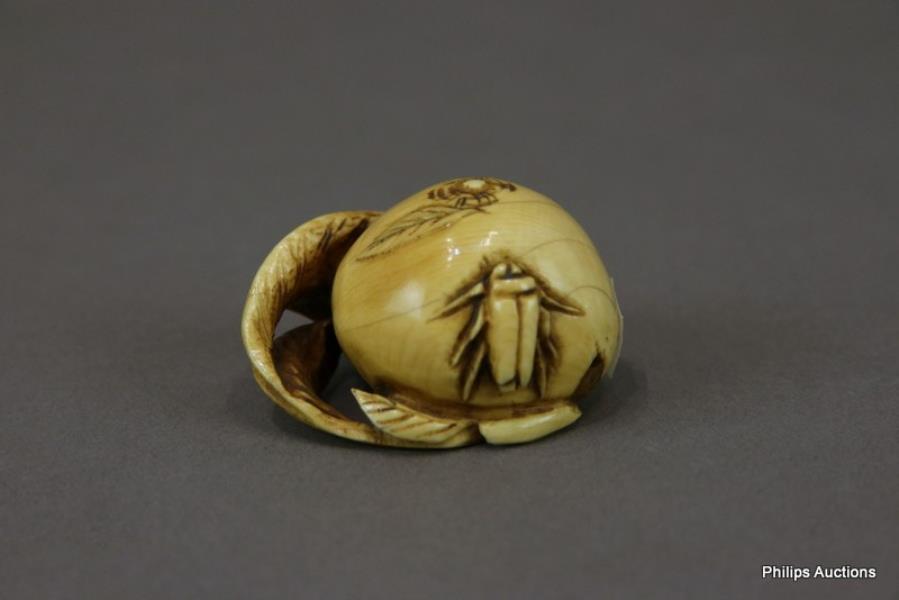 A CARVED IVORY NETSUKE OF A PEACH WITH INSECT