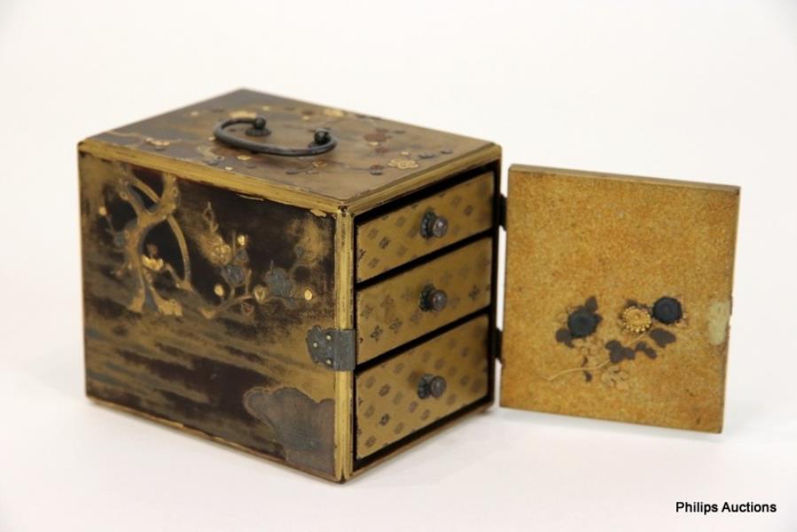 With a hinged door opening to reveal three graduated drawers, with silvered metal hinges, pull knobs and carry handle (door catch missing), the exterior decorated in gold and silver hiramaki-e and takamaki-e with blossoming branches of autumn flowers nogiku (daisy), the reverse of the door with kiku (chrysanthemum) branch upon a nashiji ground, the drawer fronts diaper patterned, unsigned.