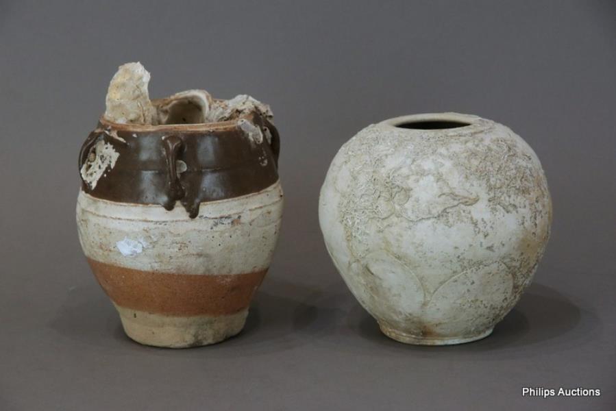 Comprising a parcel brown glazed stoneware jar and a Cirebon shipwreck (Indonesia) Yue ware ovoid jar with lotus pattern, both encrusted, the first one with label from Mossgreen.