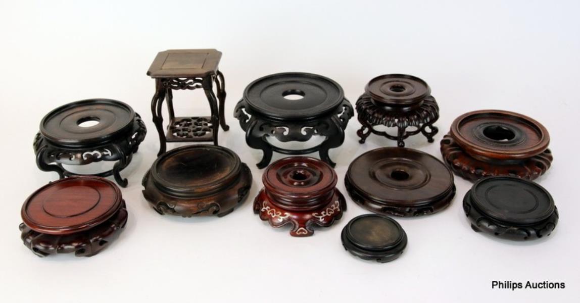 Comprising 11 carved mostly circular hardwood stands of various sizes and shapes, including a hardwood lotus form stand.