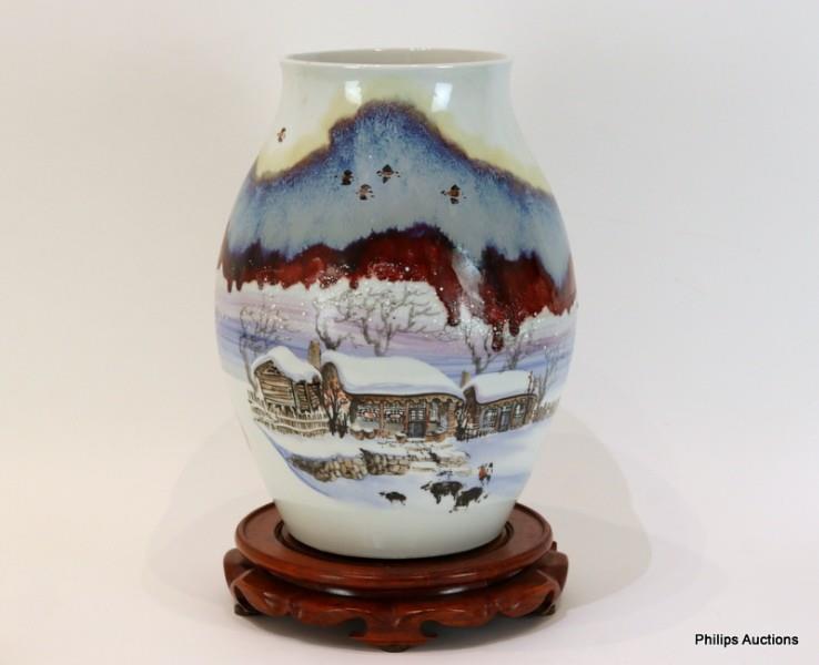 Decorated with a rural landscape in winter including figures and birds, with a flambe glaze effect to evoke a snowy mountainous landscape, with inscriptions, upon a carved rosewood stand.