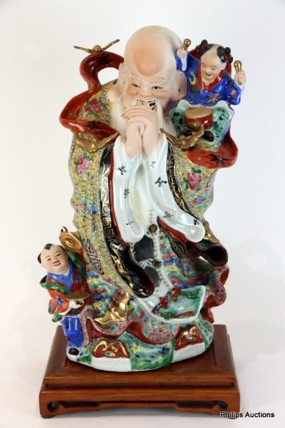 A LARGE PORCELAIN FIGURE OF SHOULAO WITH CHILDREN ON STAND