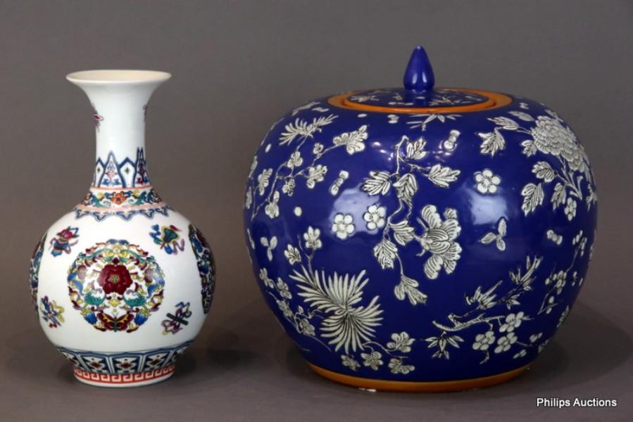 Comprising a large porcelain jar and cover decorated with white flowers upon a blue ground, bearing a Jiaqing seal mark to the underside, together with a bottle vase transfer decorated with floral medallions and auspicious symbols.