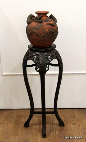 The Japanese red clay globular vase decorated with a three-clawed dragon in high relief encircling the shoulder above another parcel gilt dragon in low relief, with painted highlights, the underside with stamped mark, upon a carved and floral pierced pedestal stand with a beaded circular top and foliate shaped legs united by stretchers.