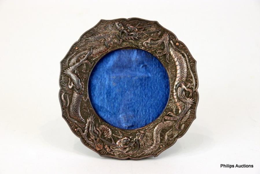 The circular frame with a barbed rim, finely repoussé with two dragons three-clawed dragons upon a scale ground, with circular aperture and easel back.